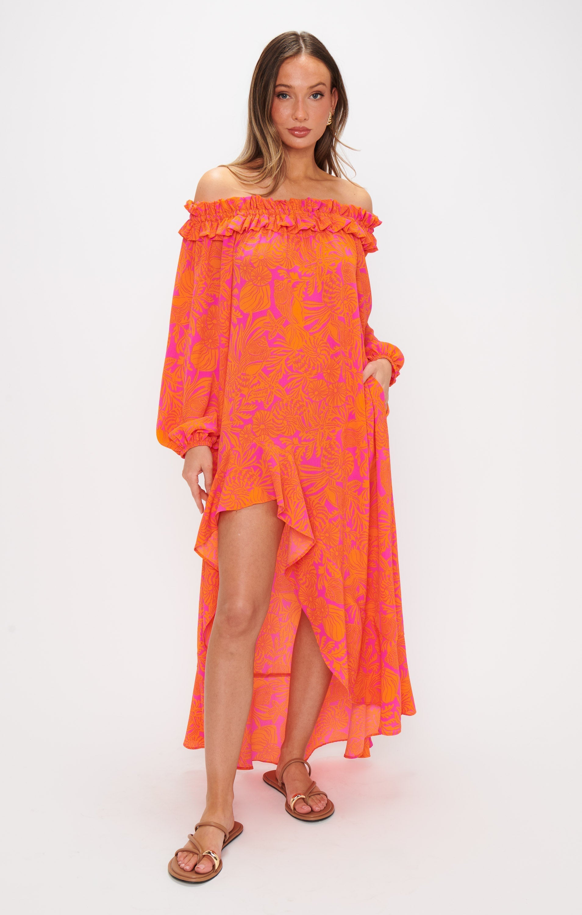 The Bobbi Maxi is your new sunshine staple. With an off-shoulder neckline, flowy long sleeves, and a high-low hem, this lightweight textured dress makes every day feel like a getaway. The removable waist tie lets you adjust your fit, while the side pockets keep it practical. Add your fave sandals, and you're set for some fun in the sun.
