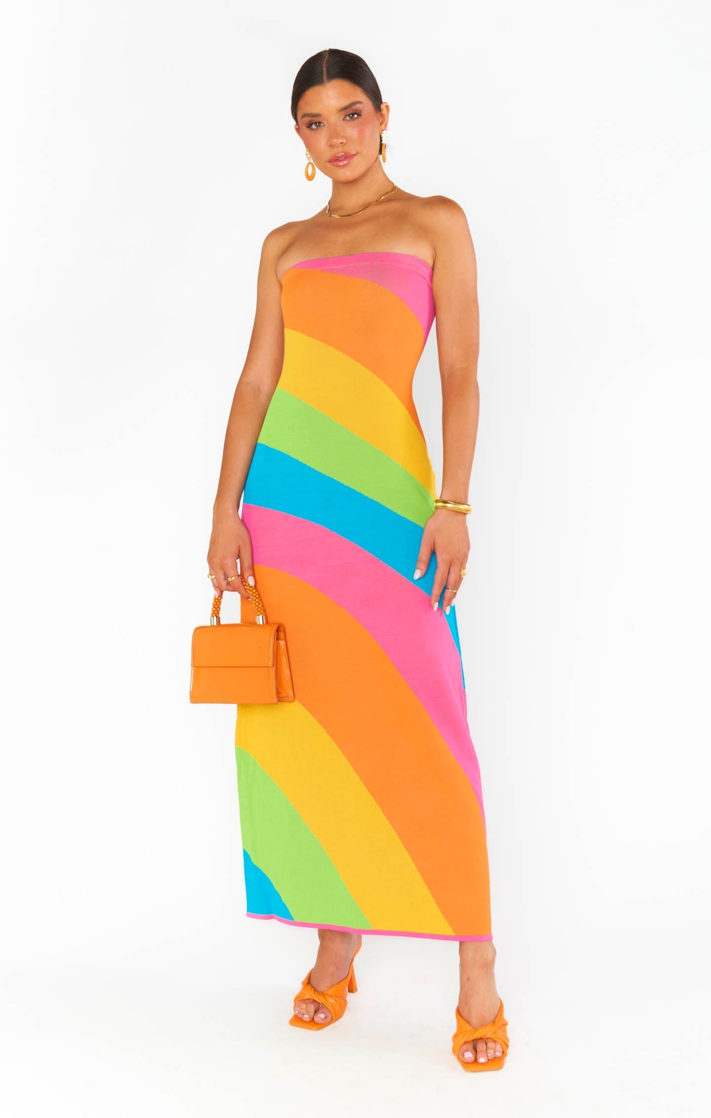 Turn up the heat in our Island Nights Tube Dress! This strapless rainbow maxi hugs all the right places on those hot summer nights. Pair this statement dress with gold jewelry and platform heels for a night out!