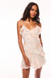 So in love with the Lomina Dress. The mini version of our best-selling Rialto Dress, the Lomina returns with a printed jacquard chiffon silk blend fabric featuring a custom winding ribbon jacquard design all over. The flirty piece stuns with overlapping, asymmetrical ruffles at the neckline that descend through the slightly fitted skirt.