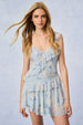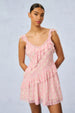 The Serima Dress is back as part of our Fragrance Capsule collection, this time arriving in our best-selling perfume prints.. This gorgeous sun dress is designed with a printed viscose chiffon fabric. The mini begins with tank top straps above a slight v-neckline adorned with tiny ruffles. An asymmetrical ruffle lines the bodice before descending to the airy, pleated skirt.